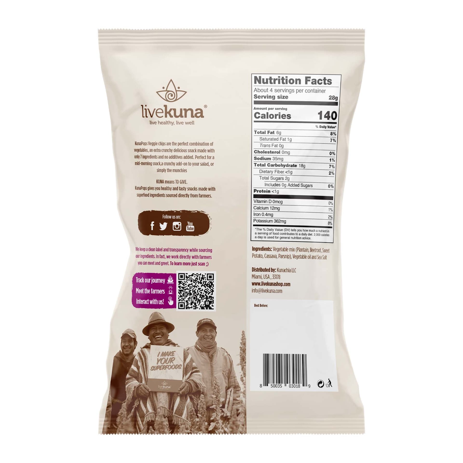 Vegetable mix (Plantain, Beetroot, Sweet Potato,Cassava, Parsnip), Vegetable oil and Sea Salt.