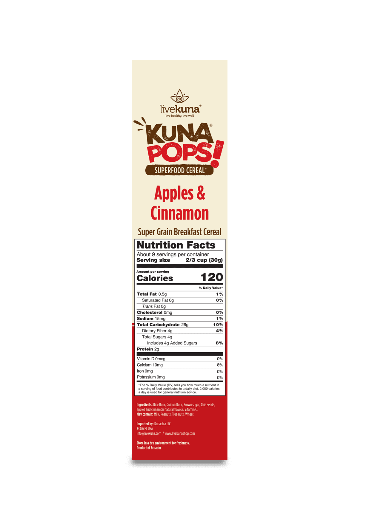 Rice flour, Quinoa flour, Brown sugar, Chia seeds, apples and cinnamon natural flavour, Vitamin C.